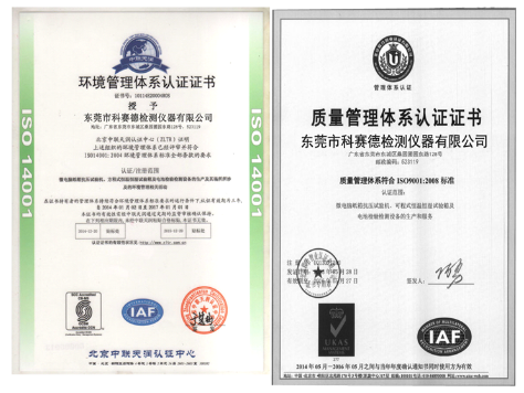 科賽德儀器通過ISO9001認證,各個生產環節都嚴格按照標準化執行,以確保所制造的每一臺設備達標,多重嚴格質檢,每臺設備出廠前,均經過7X24小時穩定性測試,保證品質100%合格率。